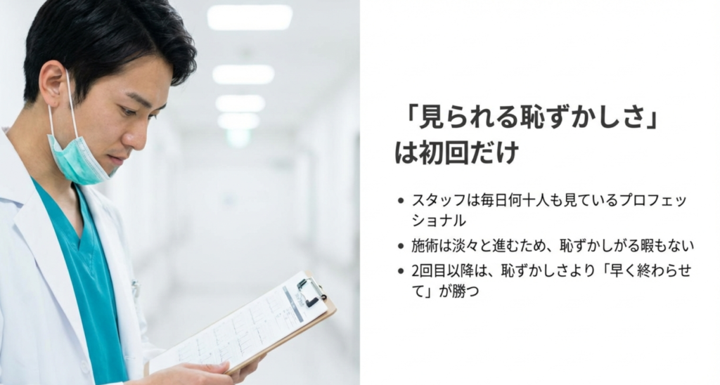 「スタッフさんの前で下半身を晒すのが恥ずかしい」という悩みは、ほぼ100%の男性が最初に抱くものだと思います。僕も最初は「変な目で見られたらどうしよう」「反応してしまったらどうしよう」と不安でいっぱいでした。でも、実際に施術を受けてみると、スタッフさんは驚くほど淡々と作業を進めてくれます。