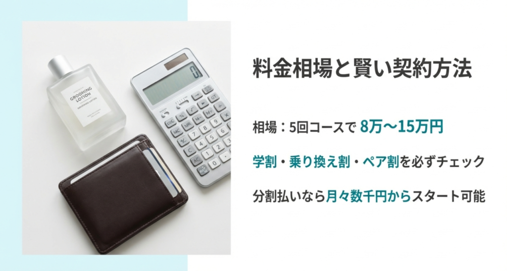 VIO脱毛の料金は、部位単体で見るとだいたい5回コースで8万円〜15万円くらいが相場かなと思います。これに顔や全身をセットにするとお得になるクリニックが多いですね。決して安い買い物ではありませんが、一生モノの清潔感を手に入れられると考えれば、自己投資としてのコスパは悪くないと僕は思っています。ただ、少しでも安く抑えたいならキャンペーンのチェックは必須ですよ。