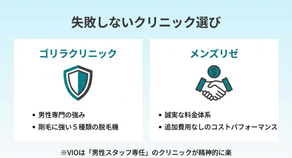 メンズ脱毛を検討しているなら、必ずと言っていいほど名前が挙がるのが「ゴリラクリニック」と「メンズリゼ」ですよね。僕自身の体験や仲間の話を総合すると、どちらも非常にレベルが高いですが、それぞれ特色があります。ゴリラクリニックは、とにかく「男性専用」としての強みが凄いです。ドリンクサービスがあったり、院内の内装が男らしくて格好良かったりと、通うこと自体にステータスを感じさせてくれます。