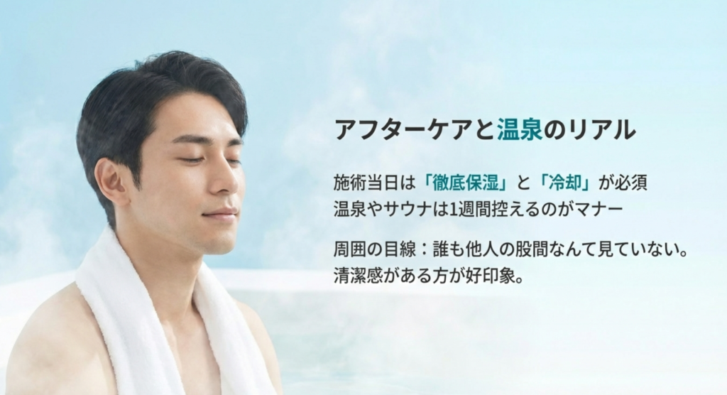 脱毛が進んでくると、「銭湯や温泉で浮かないかな?」と気にする男性も多いですよね。実際、僕はよくサウナや銭湯に行きますが、結論から言うと誰も他人の股間なんて見ていません(笑)。最初は隠したくなる気持ちもありますが、最近はVIO脱毛をしている男性が非常に増えているので、ツルツルの人が一人いても全く不自然ではなくなりました。むしろ、清潔感があって良いというポジティブな評価の方が多いように感じます。