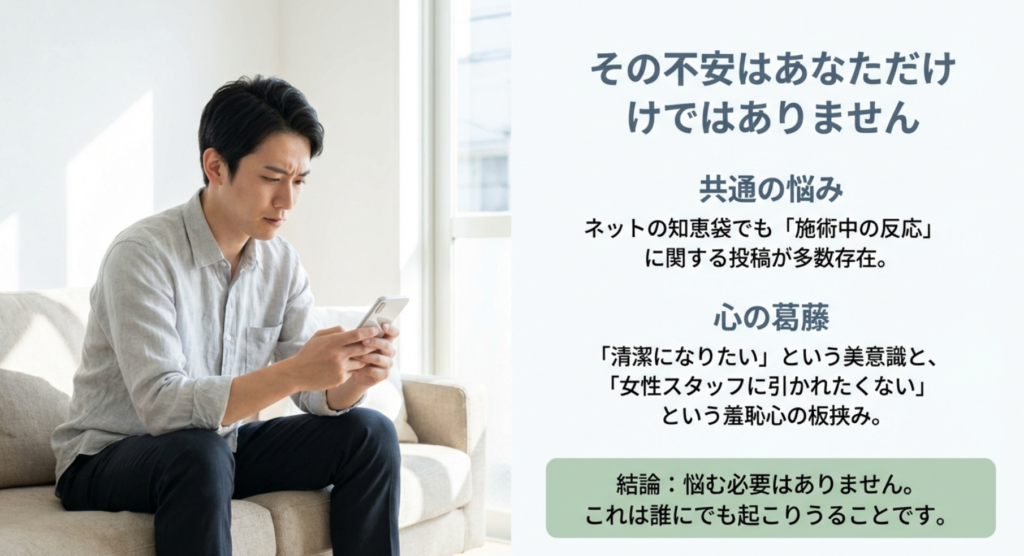 そう、施術中に反応してしまったらどうしようという問題です。ネットの掲示板や知恵袋を見ても、男の脱毛でVIOがたつのは恥ずかしい、女性スタッフさんに嫌な顔をされるんじゃないか、痛いのが原因で逆に反応することってあるの、といった切実な悩みがたくさん書き込まれています。僕自身、最初は同じような不安でガチガチになっていたので、その気持ちは痛いほどよく分かります。