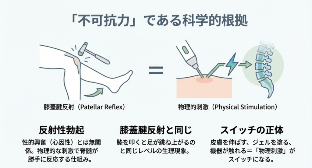 脱毛の施術では、照射漏れを防ぐためにスタッフさんが皮膚を丁寧に伸ばしたり、冷却ジェルを塗ったり、機器を密着させたりしますよね。これらの「触れられる」という物理刺激そのものが、本人の意思とは無関係にスイッチを入れてしまうわけです。これは膝を叩くと足が勝手に跳ね上がる「膝蓋腱反射」と同じレベルの不可抗力。