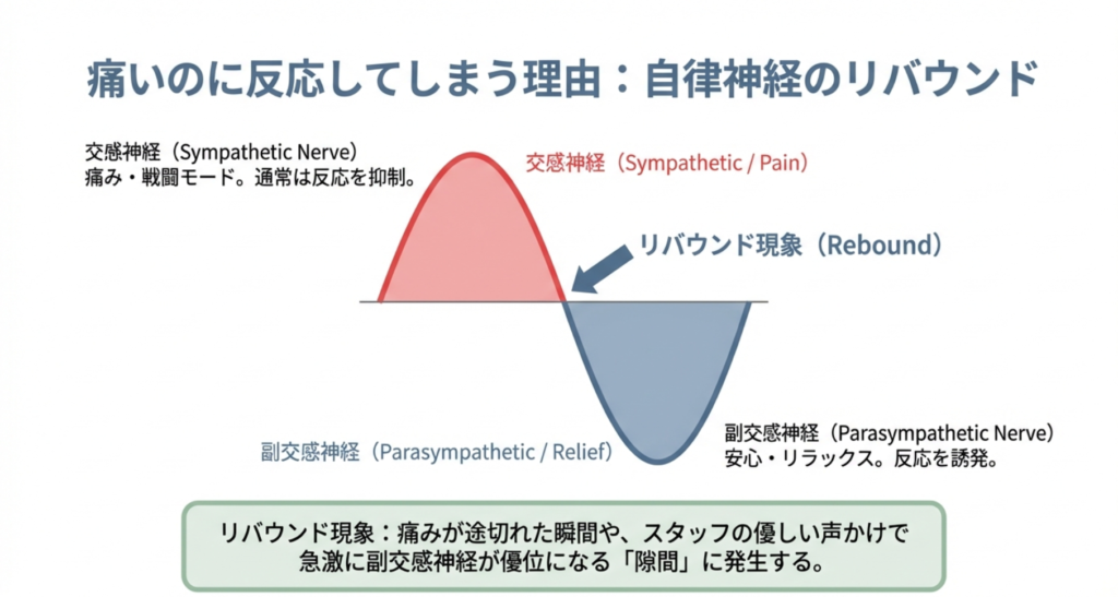痛みに必死に耐えて緊張している状態から、ふっと痛みが途切れたり、スタッフさんの優しい声かけで安心したりした瞬間、今度はリラックスを司る「副交感神経」が急激に優位になります。この自律神経のリバウンド現象によって、自分でも予想外のタイミングで反応が起きてしまうことがあるんです。「痛いのにたつ」というのは、決して矛盾したことではなく、自律神経が正常に機能している証拠だと言えますね。