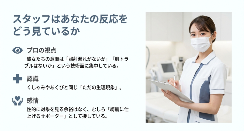 そのため、来店してくれたこと自体に感謝とリスペクトを持って接しているんです。施術中に反応が起きたとしても、彼女たちにとっては「くしゃみ」や「あくび」と同じ程度の生理現象に過ぎません。意識の矛先は「照射漏れはないか」「肌トラブルは起きていないか」という技術的なポイントに集中しており、反応そのものを性的に捉える余裕すらないのが現実です。