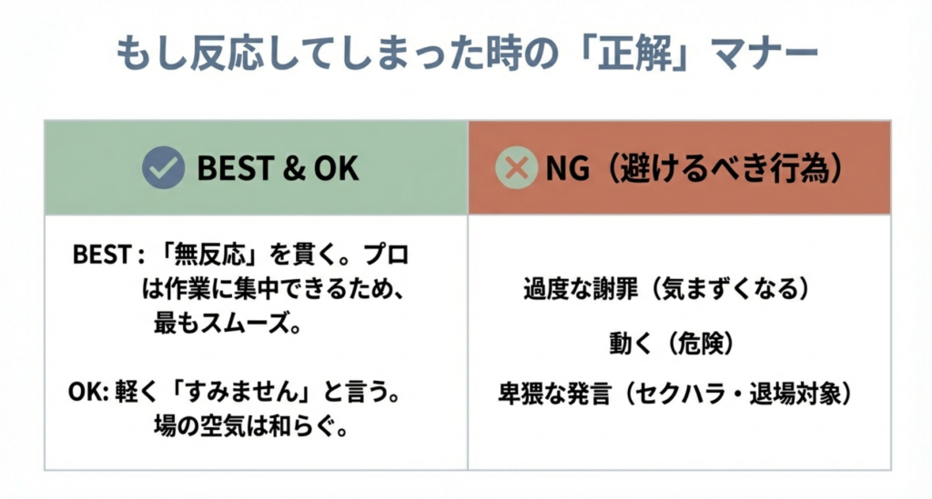 万が一反応してしまったとき、律儀な男性ほど「すみません!」と謝りたくなりますよね。でも、実は過剰に謝る必要はありません。スタッフ側からすれば、謝られることで「これは謝罪が必要な特別な事態なんだ」と再認識させられてしまい、かえって気まずい空気が流れてしまうことがあるからです。