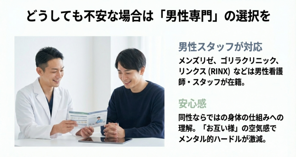 同性同士であれば、「男としての体の仕組み」を共有しているという安心感があります。もし反応しても「まあ、そうなるよね」とお互いに無言の了解で進められるので、メンタル的なハードルは格段に下がります。自分のプライドや性格に合わせて、最適な環境をリサーチしてみてください。最終的な判断は専門家にご相談くださいね。