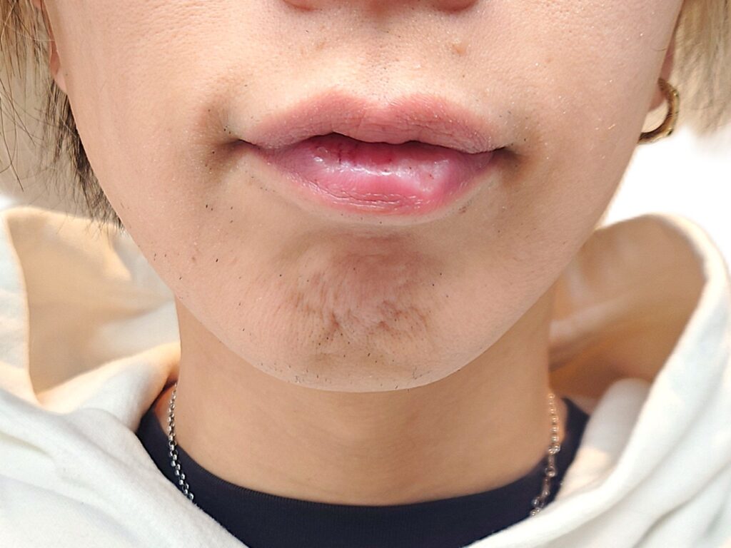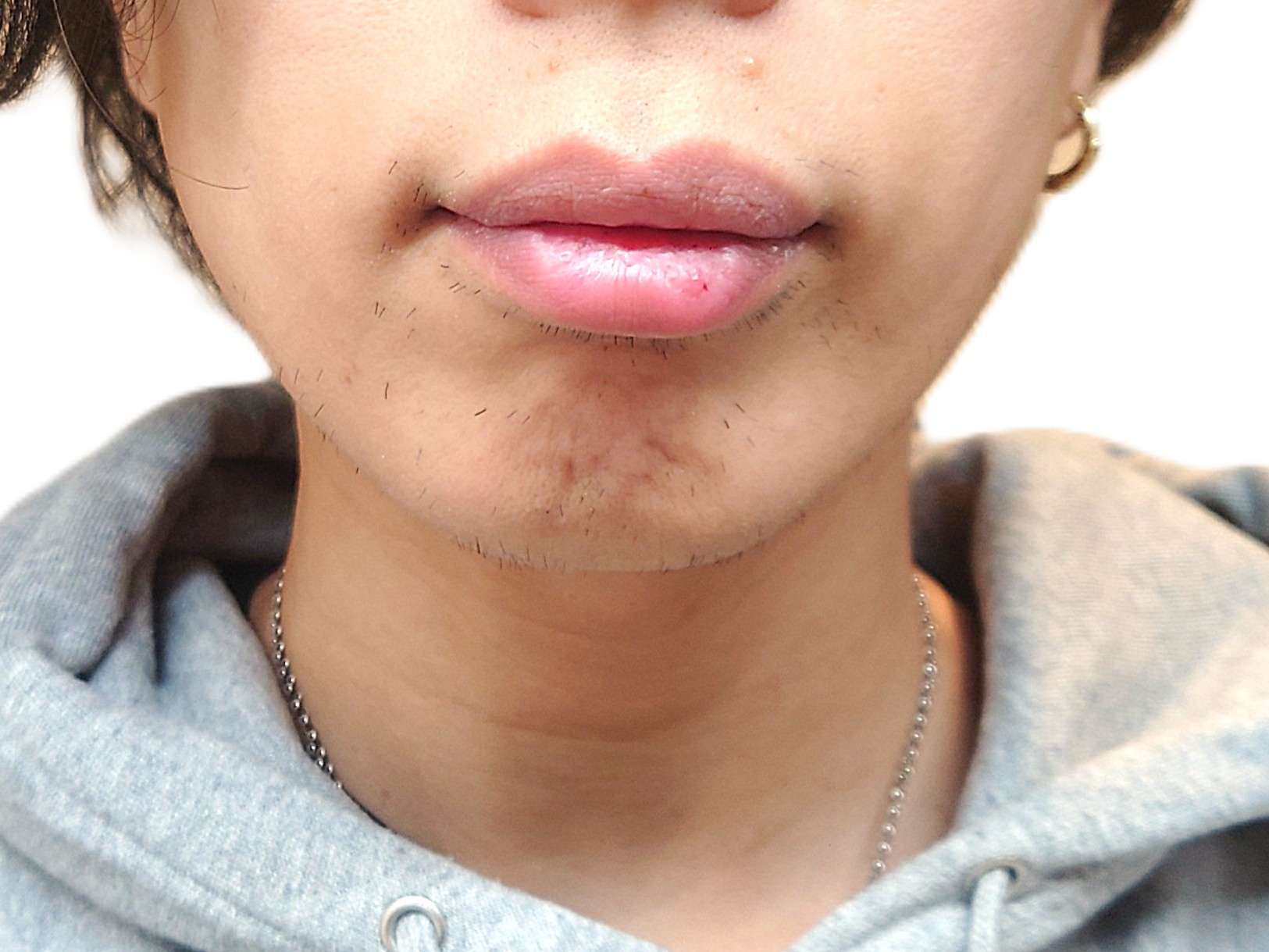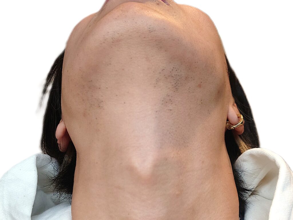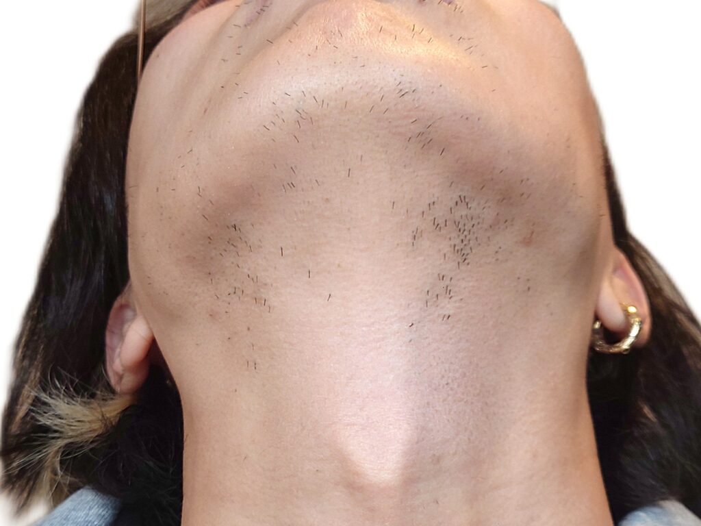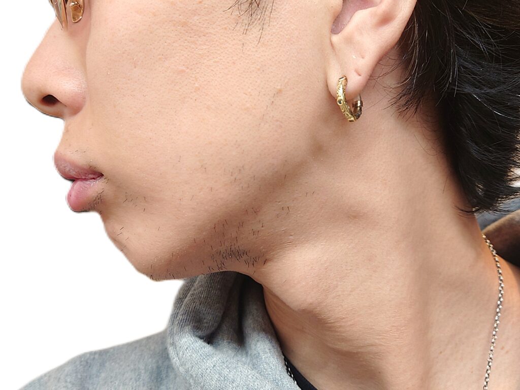 アゴ、アゴ下、フェイスライン、口周りのヒゲが復活している状態です。特にアゴ下の一部が濃く目立ちます。
