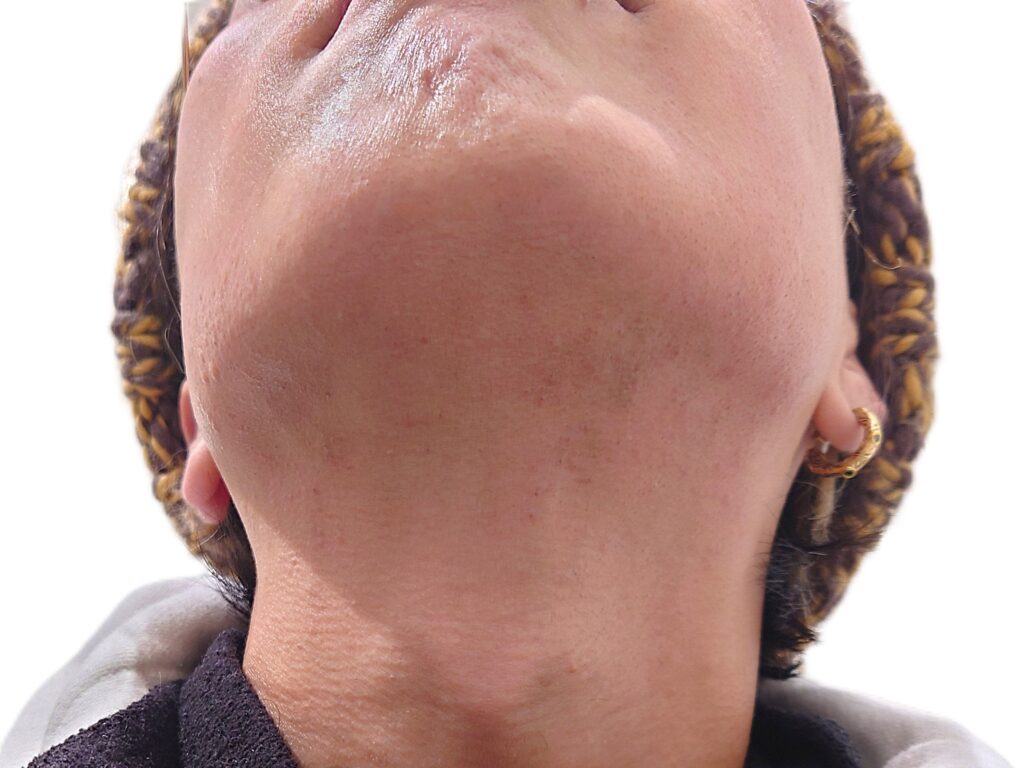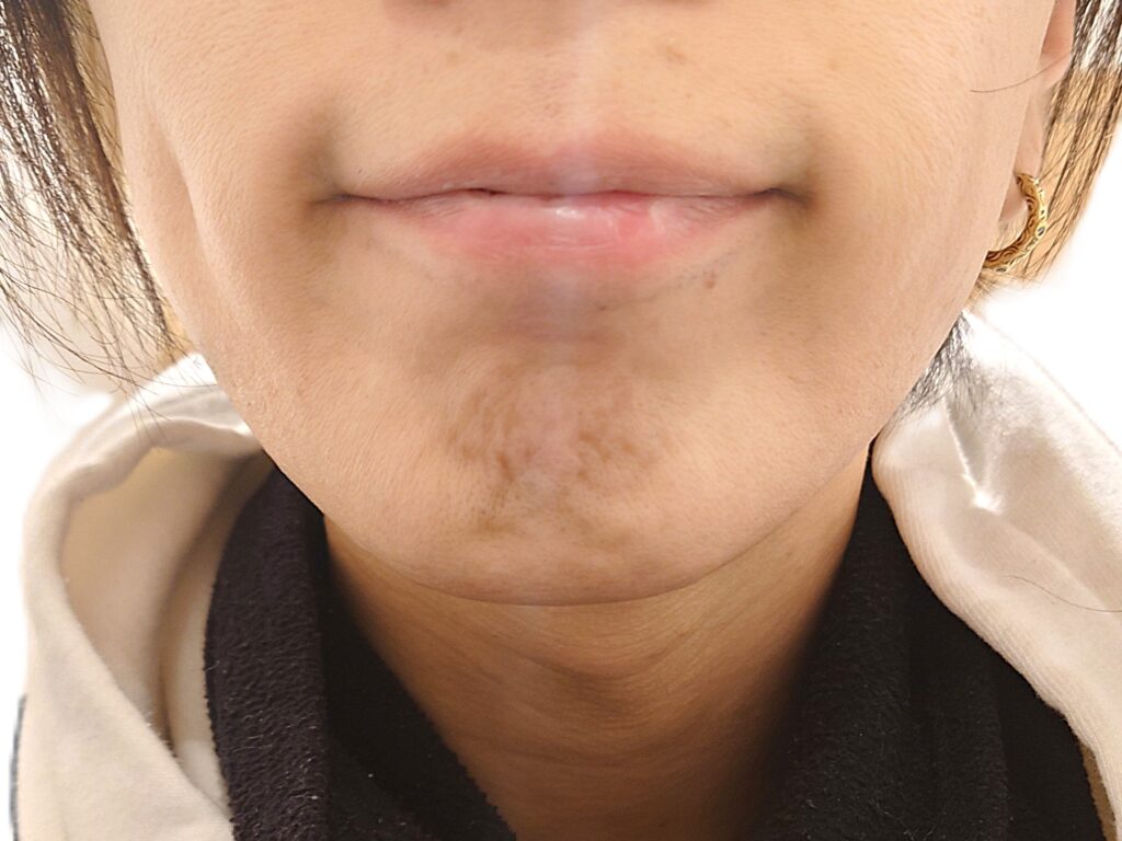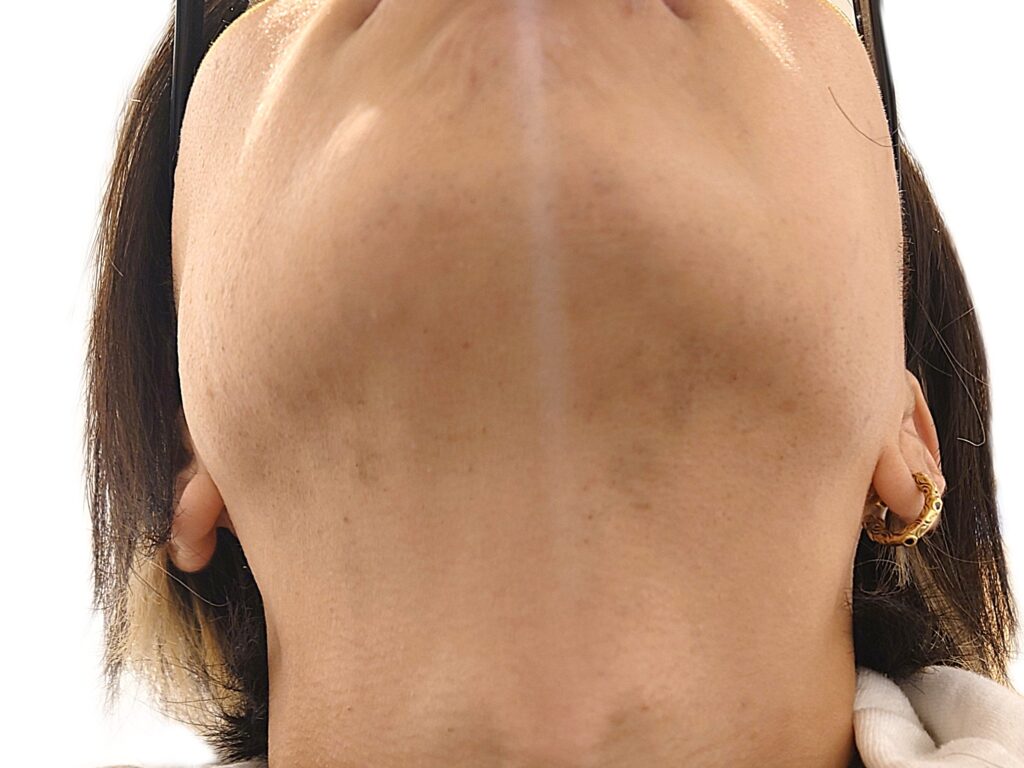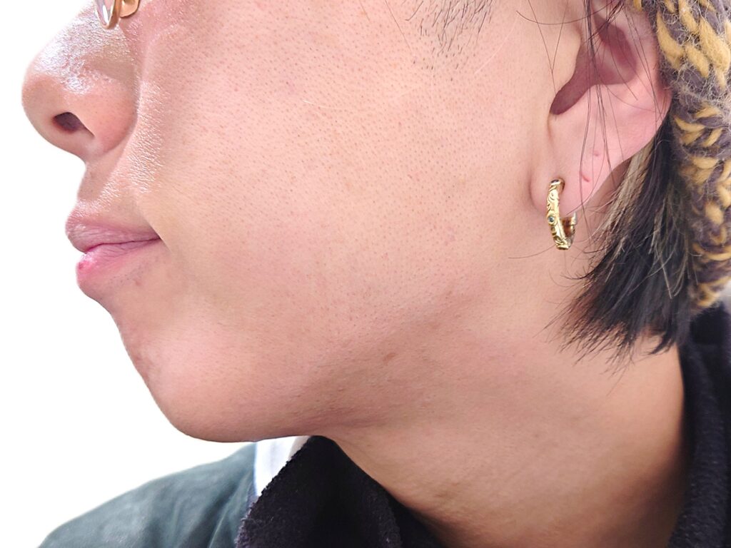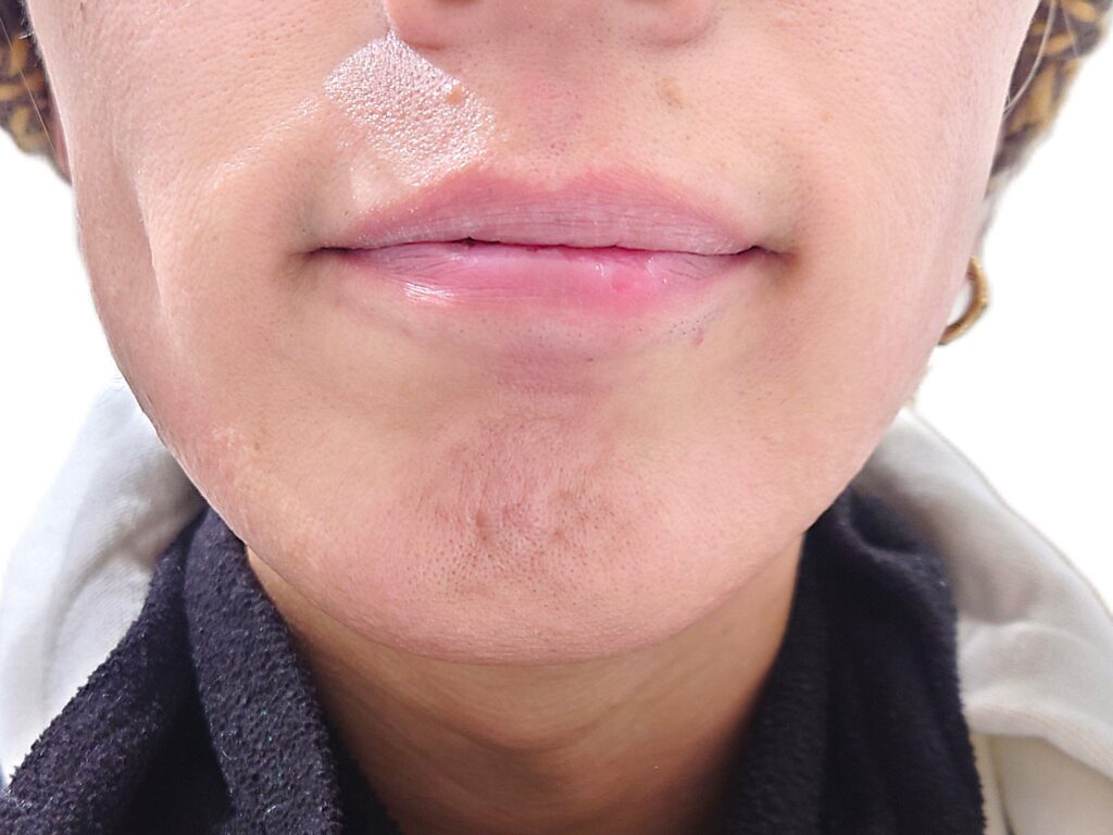 アゴ、アゴ下、フェイスライン、口周りのヒゲが復活している状態です。特にアゴ下の一部が濃く目立ちます。