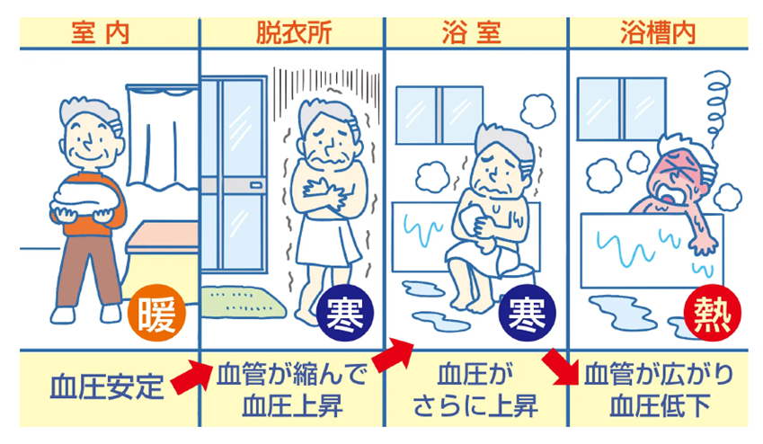 ヒートショックとは、急激な温度変化に体が対応しきれず、血圧が激しく変動することで起こる健康障害です。